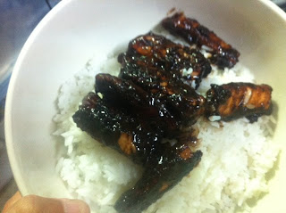 ผลงานออกมาเป็นชิ้นปลาดำๆ แต่ว่าอร่อยมาก รสชาตเหมือนข้าวหน้าปลาไหลญี่ปุ่น ต้องลองนะ ของเค้าดีจริงๆ แม็กกี้ ผงไก่เทอริยากิ (ถ้านำไปนึ่งคงจะไม่ดำออกสวย)