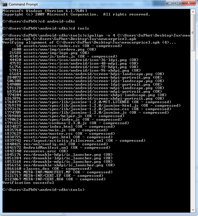 เรียก cd android-sdks\tools เพื่อใช้ zipalign จัดการ pack APK ให้อยู่ในรูปแบบที่พร้อมจะวางตลาด โดยใช้คำสั่ง zipalign -